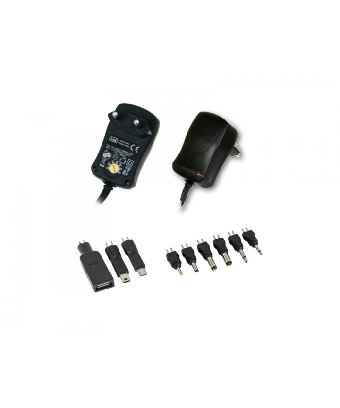 Alimentation universelle 2250mA Stabilisée Trevi TA 127 UE. Complet avec 7 adaptateurs plus 3 USB nominale Connexions universelles, le TA 127 UE peut alimenter Mp3, lecteurs de DVD, les téléphones portables, radio et d'autres appareils qui nécessitent une alimentation et de la tension jusqu'à 12V DC