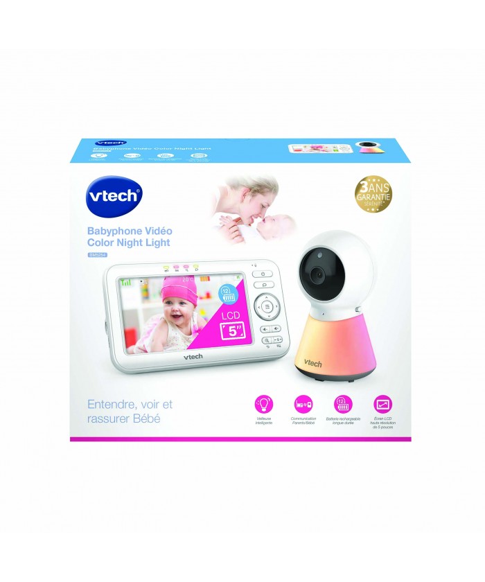 Babyphone Vidéo avec écran 5", veilleuse intelligente, sons apaisants et berceuses ! Babyphone vidéo avec grand écran couleur LCD haute résolution de 5 pouces (12,7 cm) Le grand écran haute résolution permet de surveiller le moindre mouvement de Bébé. La caméra infrarouge s'enclenche automatiquement lorsque l'intensité lumineuse de la pièce diminue. Veilleuse intelligente rassurante ! Une douce lumière émane du pied de la caméra pour illuminer la pièce. L'intensité de la veilleuse s'adapte en fonction de la luminosité de la chambre pour créer le meilleur environnement de sommeil possible pour Bébé. Sept jolies couleurs sont disponibles sur ce babyphone. Une fonction Auto permet de déclencher la veilleuse au moindre son détecté dans la pièce dans laquelle se trouve Bébé s'il se réveille et pleure. Sons apaisants et berceuses ! 5 berceuses et 4 sons apaisants peuvent être déclenchés par les parents à distance pour rassurer Bébé. Communication Parents/Bébé ! L'unité Parents du babyphone vidéo est équipée d'un microphone permettant de parler à Bébé depuis une autre pièce, sans avoir à se déplacer, ni se montrer. Capteur de température ! Sur ce babyphone vidéo, un capteur mesure la température de la pièce dans laquelle se trouve Bébé. Il alerte les parents lorsqu'elle devient trop basse ou trop élevée.