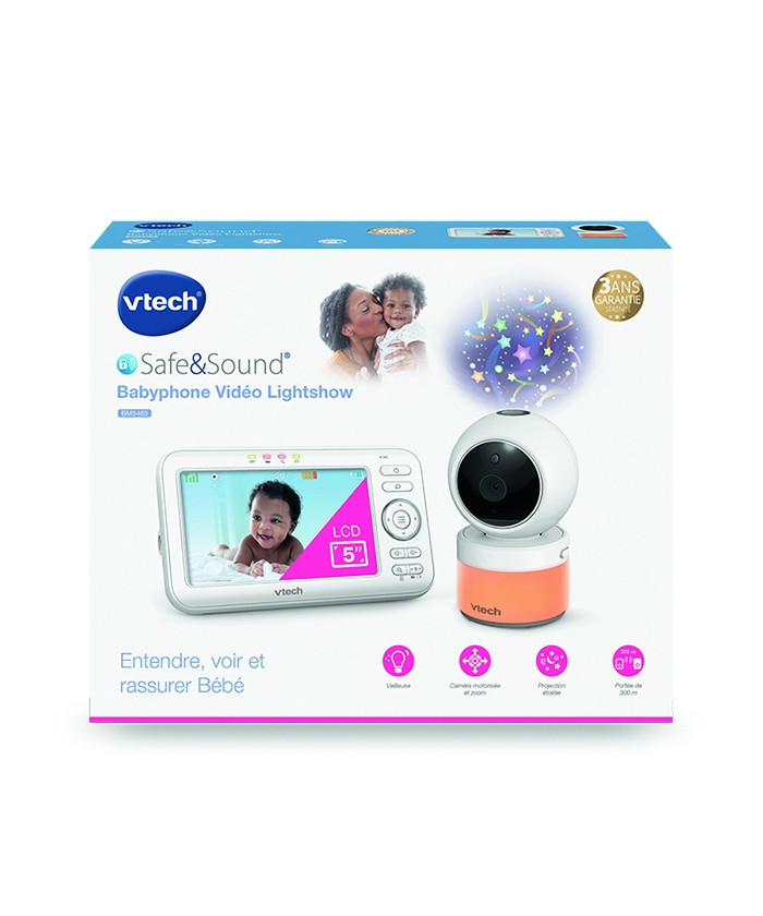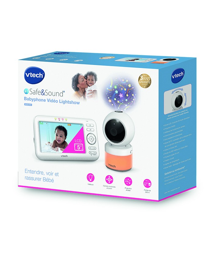 Babyphone vidéo 5" avec caméra motorisée, projection et veilleuse ! Caméra motorisée et zoom sur image ! Il est possible d'avoir une vue d'ensemble de la pièce dans laquelle se trouve Bébé. À distance, orientez l'angle de vue de la caméra de gauche à droite jusqu'à 270 degrés, ou de haut en bas jusqu'à 25 degrés. La caméra peut zoomer sur l'image jusqu'à x1,3. Veilleuse ! Il est possible de déclencher la veilleuse à distance ou directement via l'unité Bébé. Une douce lumière émane du pied de la caméra pour illuminer la pièce. Il y a 3 différentes couleurs au choix. Une fonction AUTO permet de déclencher la veilleuse au moindre son détecté dans la pièce dans laquelle se trouve Bébé s'il se réveille et pleure. Projection étoilée ! Mise en marche à distance ou via l'unité Bébé, une jolie projection étoilée et colorée illumine le plafond dans la chambre de Bébé. Même système que la veilleuse, une fois le mode AUTO activé, la projection se déclenche au moindre bruit émis par Bébé pour le rassurer, en fonction du niveau de sensibilité prédéfini. Communication parents/bébé ! L'unité Parents est équipée d'un microphone permettant de parler et rassurer Bébé depuis une autre pièce, sans avoir à se déplacer, ni se montrer. Bruits apaisants et berceuses ! 5 berceuses et 4 bruits apaisants peuvent être déclenchés à distance pour rassurer et calmer Bébé s'il se réveille et pleure.
