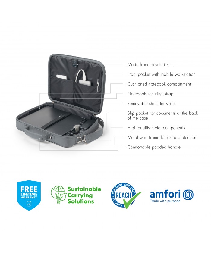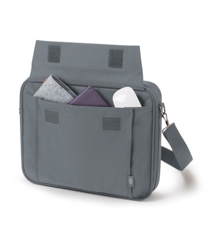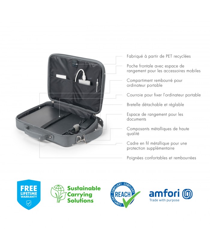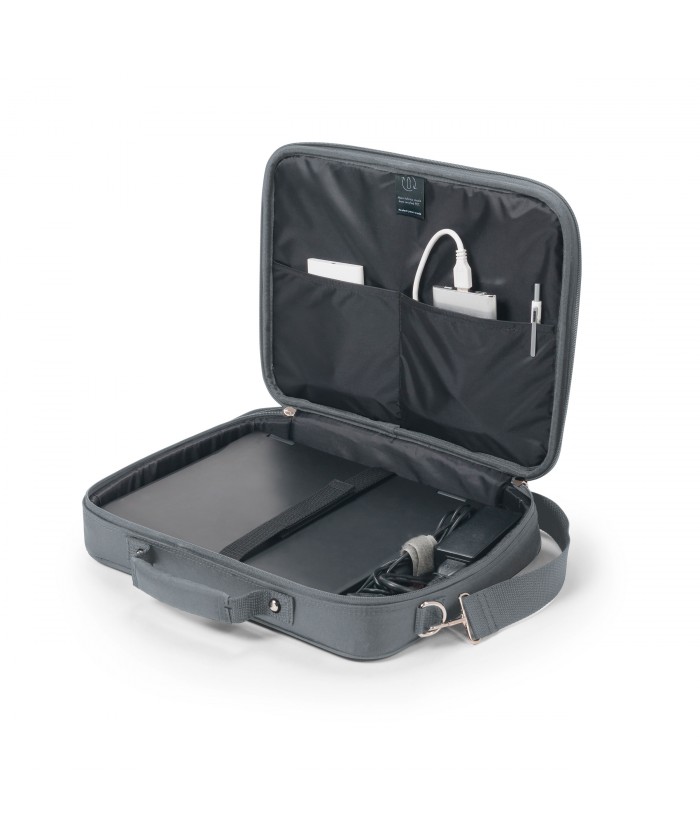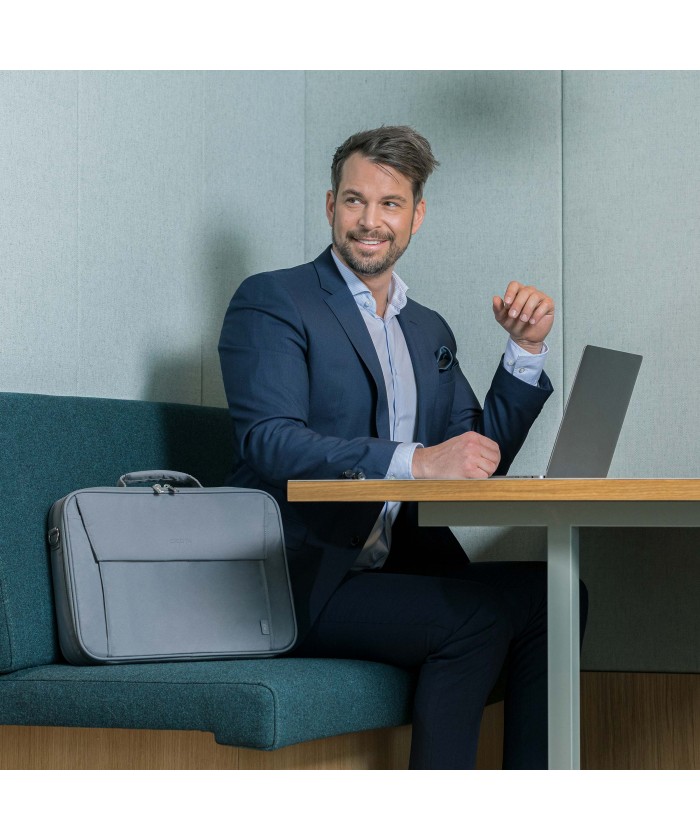 Le sac Clamshell Eco Multi BASE pratique protège votre ordinateur portable de manière optimale grâce à son compartiment rembourré. Les appareils à partir de 14-15.6" sont non seulement parfaitement sécurisés, mais aussi fixés par la sangle de serrage dans le compartiment. Une stabilité et une protection supplémentaires sont garanties par le cadre en fil métallique. Avec sa légèreté parmi les sacoches d'ordinateurs portables, l'Eco Multi Base garantit une mobilité flexible. Dans le compartiment avant pratique, vous trouverez suffisamment de place pour le smartphone ou d'autres accessoires mobiles tels que des câbles, des stylos ou des chargeurs qui doivent toujours être à portée de main. Le sac est confortable à porter, grâce aux poignées rembourrées en néoprène, et peut être attaché instantanément au chariot, grâce à une bande intégrée. En outre, le sac peut également être transporté grâce à la bretelle réglable. Cela fait de l'Eco Multi BASE le sac parfait pour tous ceux qui se déplacent souvent et qui souhaitent soutenir la réutilisation raisonnable des bouteilles en PET grâce à une solution de transport écologique.