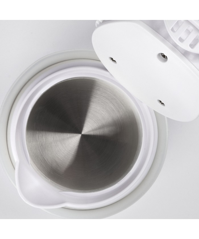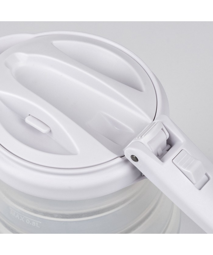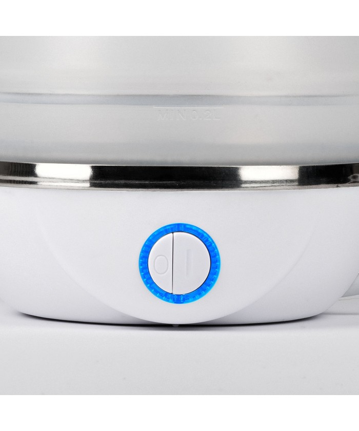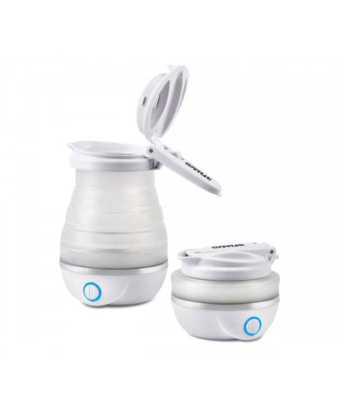 Bouilloire électrique avec pichet en silicone, peu encombrante et pliable, idéale pour une utilisation à la maison et en déplacement. Simple d'utilisation et avec arrêt automatique, il est possible d'obtenir de l'eau chaude pour infusions, thé, tisanes ou café lyophilisé. Une fois plié, son encombrement est minime, mais une fois déplié il garantit une excellente cylindrée de 800cc. Le scialytique bleu donne une touche scénique à l'utilisation.