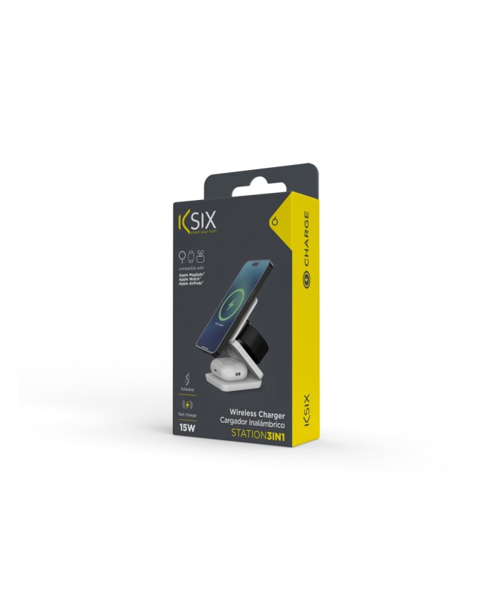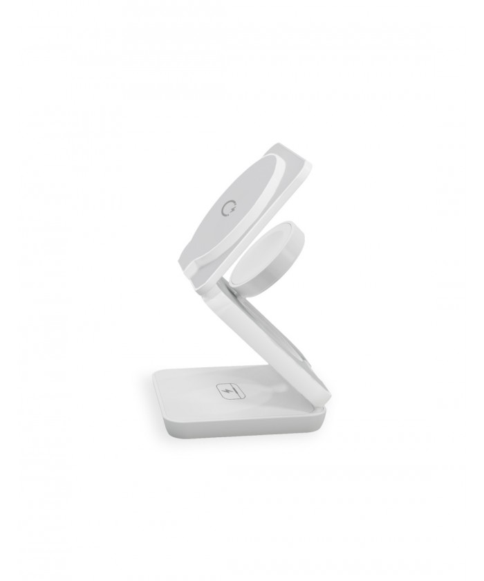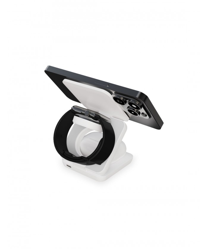Le Cube 3in1 intègre trois stations de charge différentes. La base initiale et supérieure est compatible avec les smartphones Qi, en plus d'offrir une fixation magnétique compatible avec la technologie MagSafe® d'Apple. Le support central est spécialement conçu pour charger votre Apple Watch. Et le troisième dock est compatible avec les AirPods. Cette disposition innovante vous permet de charger votre smartphone, votre Apple Watch et vos AirPods en même temps, simplifiant le processus et éliminant le besoin de plusieurs câbles et prises.