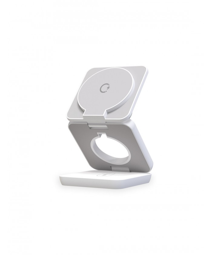 Avec le chargeur sans fil Cube 3en1, vous pouvez charger jusqu'à 3 appareils simultanément. Compatible avec les smartphones Qi ou MagSafe, ainsi qu'avec Apple Watch et Apple AirPods. Ce chargeur élimine le besoin de câbles et de prises supplémentaires. Sa conception pliable vous permet de l'emporter partout, ainsi que de l'utiliser comme support pour regarder des films et des séries. Simplifiez-vous la vie en éliminant les câbles inutiles de votre bureau ou de votre table de nuit et chargez vos appareils efficacement et rapidement avec ce chargeur sans fil.