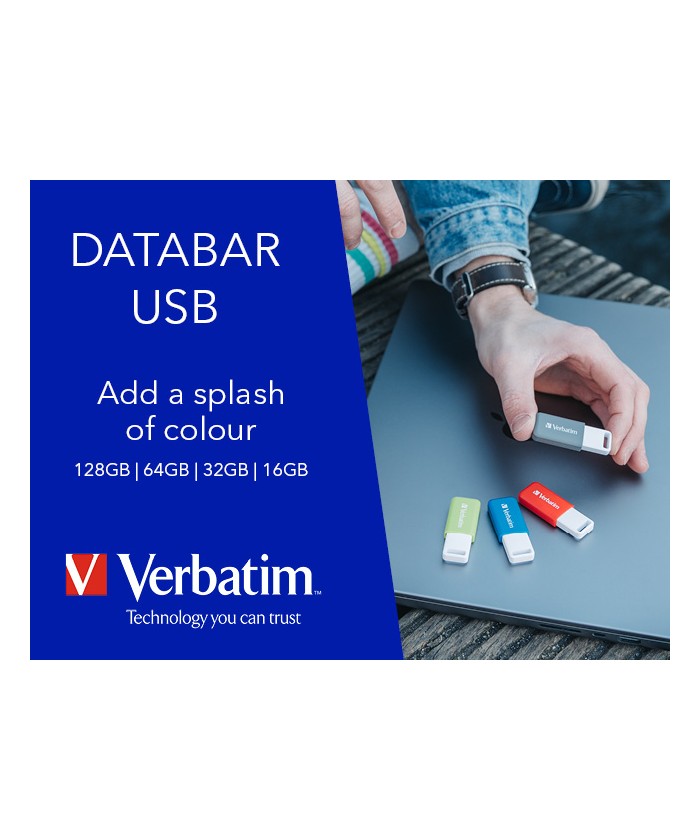 Qu'il s'agisse de projets scolaires, de photos de famille, de présentations d'entreprise ou de vidéos, la clé USB DataBar 2.0 de Verbatim permet de tout stocker et de tout déplacer facilement d'un appareil à un autre. Le mécanisme de protection repliable et très pratique permet d’avoir une clé USB compacte et de protéger l'interface lorsque vous ne vous servez pas de la clé.