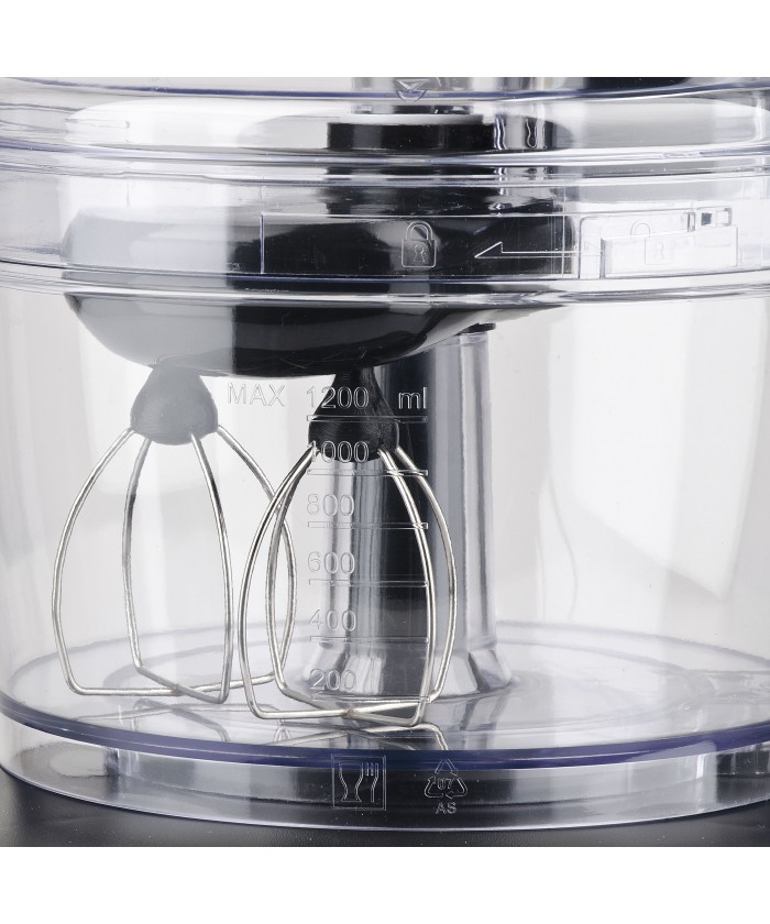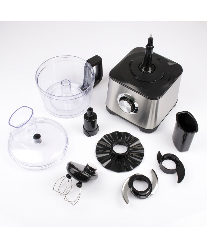 - Accessoires: lame en acier inoxydable, lame en plastique, support de lame, 2 disques de coupe, fouet en métal, récipient, couvercle avec presse-presses