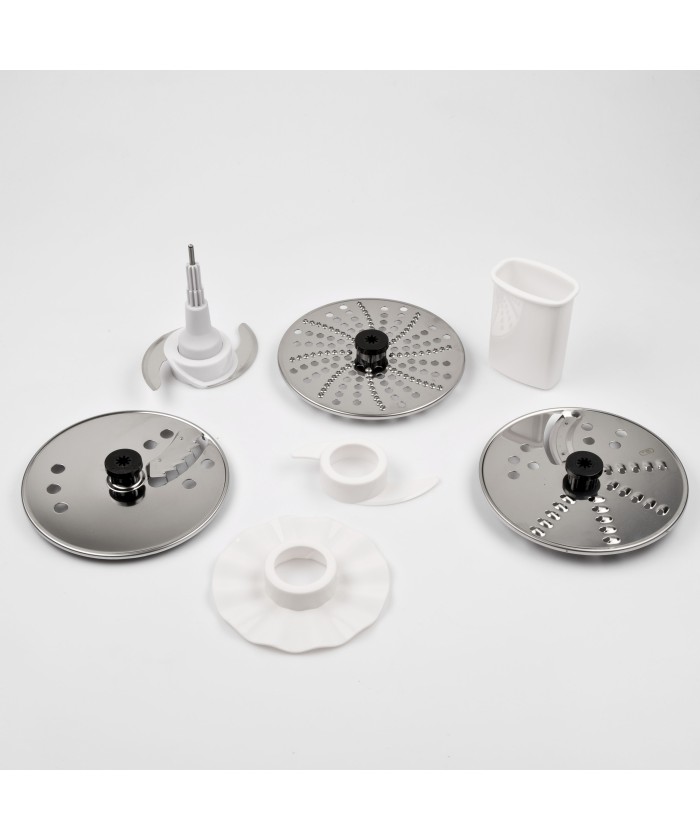 - Accessoires: lame en acier inoxydable, lame en plastique, accessoire de montage, 3 disques réversibles, mixeur, spatule