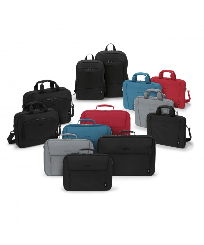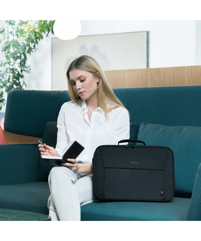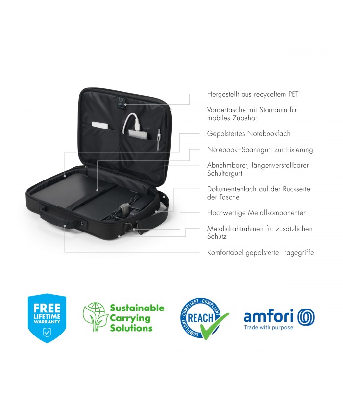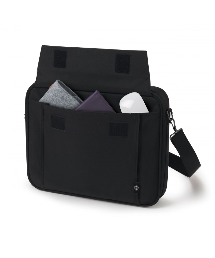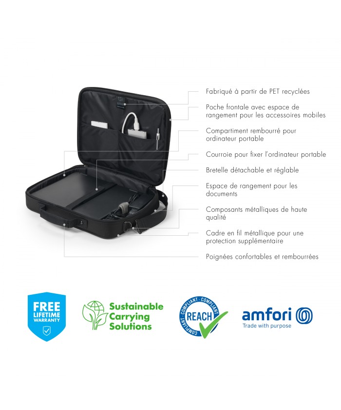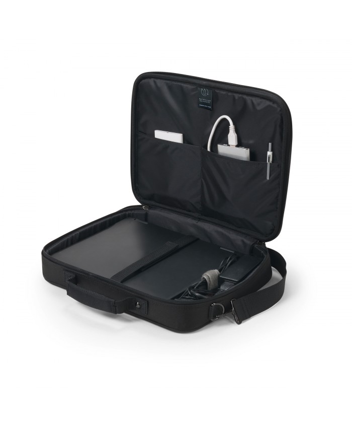 Le sac Clamshell Eco Multi BASE pratique protège votre ordinateur portable de manière optimale grâce à son compartiment rembourré. Les appareils à partir de 15-17.3" sont non seulement parfaitement sécurisés, mais aussi fixés par la sangle de serrage dans le compartiment. Une stabilité et une protection supplémentaires sont garanties par le cadre en fil métallique. Avec sa légèreté parmi les sacoches d'ordinateurs portables, l'Eco Multi Base garantit une mobilité flexible. Dans le compartiment avant pratique, vous trouverez suffisamment de place pour le smartphone ou d'autres accessoires mobiles tels que des câbles, des stylos ou des chargeurs qui doivent toujours être à portée de main. Le sac est confortable à porter, grâce aux poignées rembourrées en néoprène, et peut être attaché instantanément au chariot, grâce à une bande intégrée. En outre, le sac peut également être transporté grâce à la bretelle réglable.