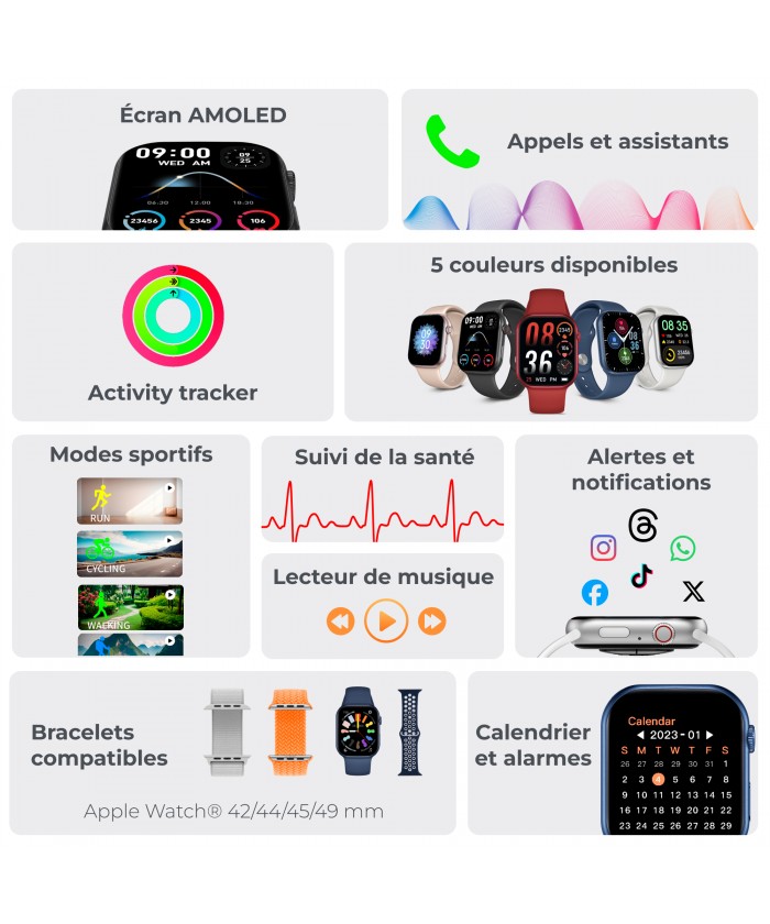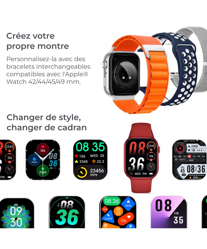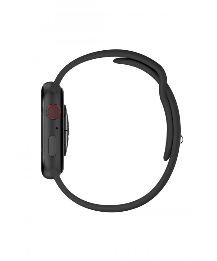Bracelet de montre connectée : 25 cm de long (boîtier inclus) x 22 mm de large. Matériau : bracelet en silicone et boucle en acier inoxydable. Ces bracelets sont compatibles avec Apple® Watch 42/44/45/49 mm.