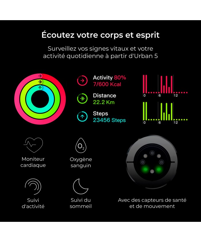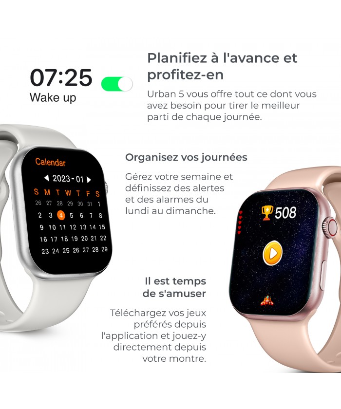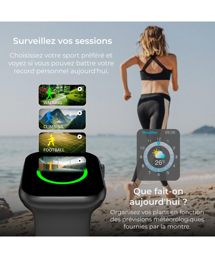 La vie est mouvement, alors bougez avec elle et votre KSIX Urban 5. Cette montre connectée dispose de plus de 100 modes sportifs différents : course à pied, vélo, escalade, badminton... Quoi que vous fassiez, nous avons tout ce qu'il vous faut ! Une fois que vous savez ce que vous allez entraîner aujourd'hui, appuyez sur play sur votre chanson préférée de l'Urban 5 et soyez en forme. Ils marchent, vous volez ! En cas de baignade en mer ou dans une piscine d'eau salée, il est recommandé de rincer la montre à l'eau douce après immersion, en raison de l'effet corrosif de l'eau salée.