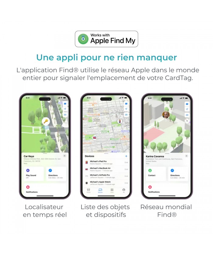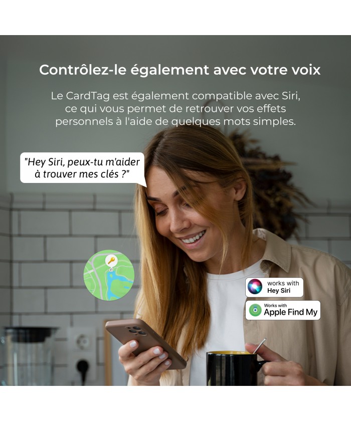 Le CardTag est certifié qualité Apple et est compatible avec les appareils Apple tels que l'iPhone, l'iPad et le Mac. Il fonctionne parfaitement avec iOS 14.5 / iPadOS 14.5 / MacOS 12.5 et versions ultérieures. De plus, sa compatibilité Siri vous permet de contrôler toutes ses fonctions avec de simples commandes vocales afin que vous puissiez localiser vos objets où que vous soyez.