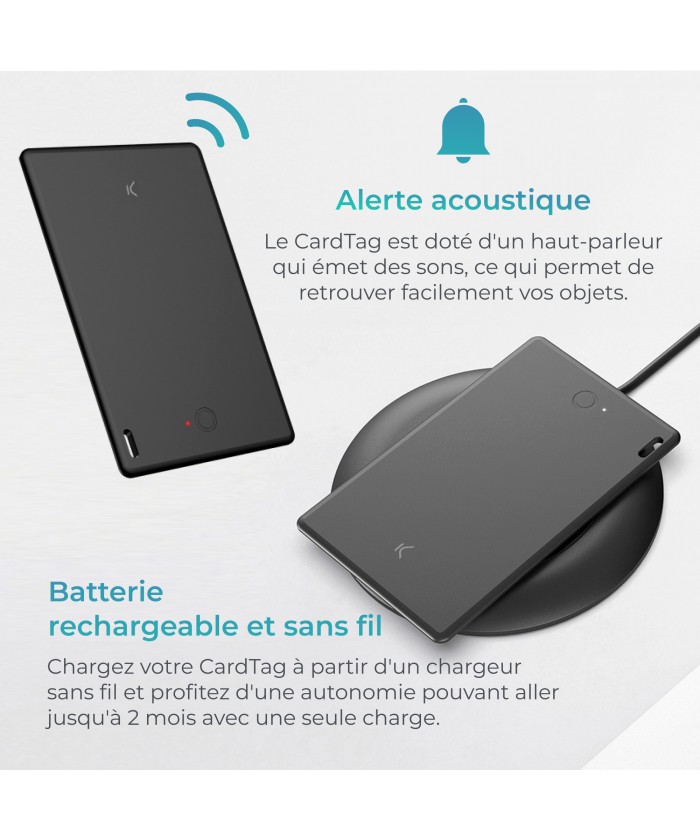 Le CardTag offre une autonomie allant jusqu'à 2 mois, vous permettant de l'utiliser librement. Une fois la batterie épuisée, ne vous inquiétez pas ! Sa méthode de chargement sans fil Qi vous permet de le recharger sans avoir besoin de câbles, simplement à l'aide d'un chargeur sans fil. De plus, il est équipé d'un indicateur LED qui vous informe du processus de charge.