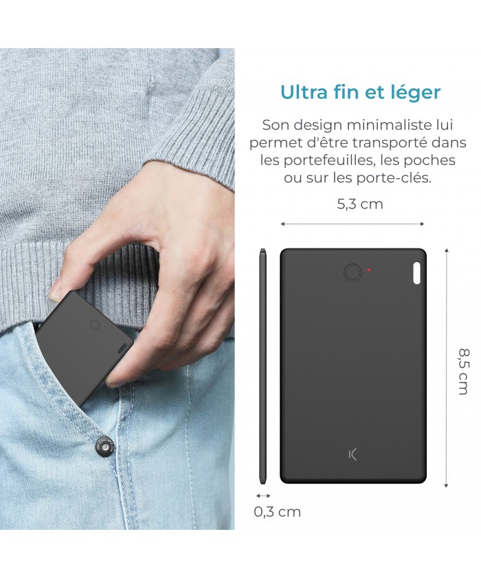 Le tracker d'objets Ksix CardTag est l'allié parfait pour garder une trace de toutes vos affaires. Avec un design ultra fin de seulement 3 millimètres d'épaisseur et pesant 12 grammes, vous pouvez facilement le transporter dans votre sac à main, votre portefeuille, vos clés ou votre sac. Il est certifié Works with Apple, compatible avec des appareils tels que iPhone, iPad ou Mac, à partir duquel vous pouvez contrôler votre tracker via l'application Find My®. Il dispose d'une batterie rechargeable avec chargement sans fil, avec jusqu'à 2 mois d'autonomie, afin que le chargement ne soit pas un problème. Simplifiez-vous la vie et ne perdez plus de temps à chercher vos objets les plus précieux grâce au Ksix CardTag.