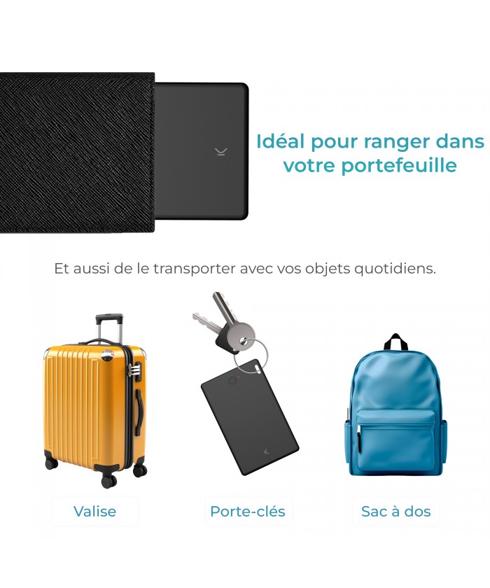 Le CardTag se distingue par son design compact, avec des dimensions de 8,5 x 5,3 x 0,3 centimètres et un poids ultraléger de seulement 12 grammes. Un gadget minimaliste et extra fin qui s'adapte parfaitement à tous vos accessoires tels que des sacs à main, des sacs, des portefeuilles ou des porte-clés. Le compagnon idéal au quotidien qui prend un minimum de place.