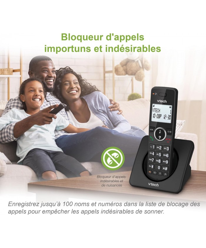 Évitez les appels importuns et indésirables. La fonction de blocage des appels de VTech vous permet de bloquer les appels importuns et les appels provenant de numéros inconnus. Bloquez jusqu'à 100 numéros sur liste noire.** v