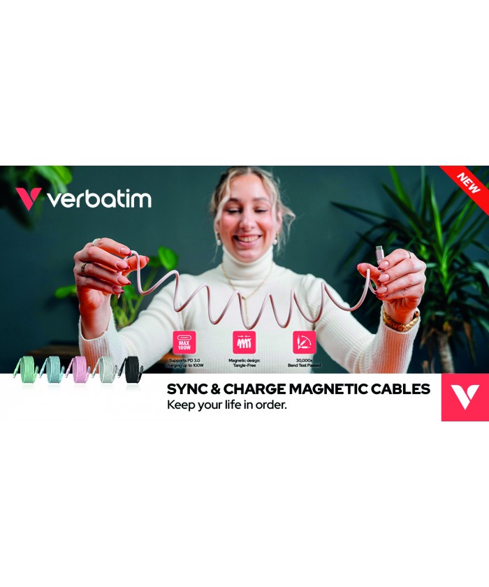 Expérimentez la charge rapide et le transfert de données rapide avec le câble magnétique de synchronisation et de rechargement 100W de Verbatim. Prenant en charge jusqu'à 100 W de puissance et des vitesses de transfert jusqu’à 480 Mbit/s, ce câble est conçu pour prendre en charge les appareils gourmands en énergie tels que les ordinateurs portables et les accessoires haute performance, ainsi que les smartphones et les tablettes, garantissant que vos appareils restent alimentés et prêts à l'action.