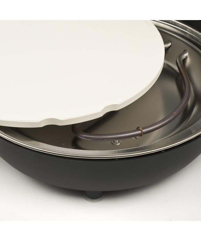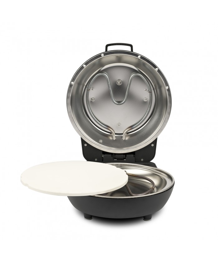Les accessoires inclus sont la pierre réfractaire amovible et réversible et les 2 plateaux en acier inoxydable pour le chargement des pizzas.