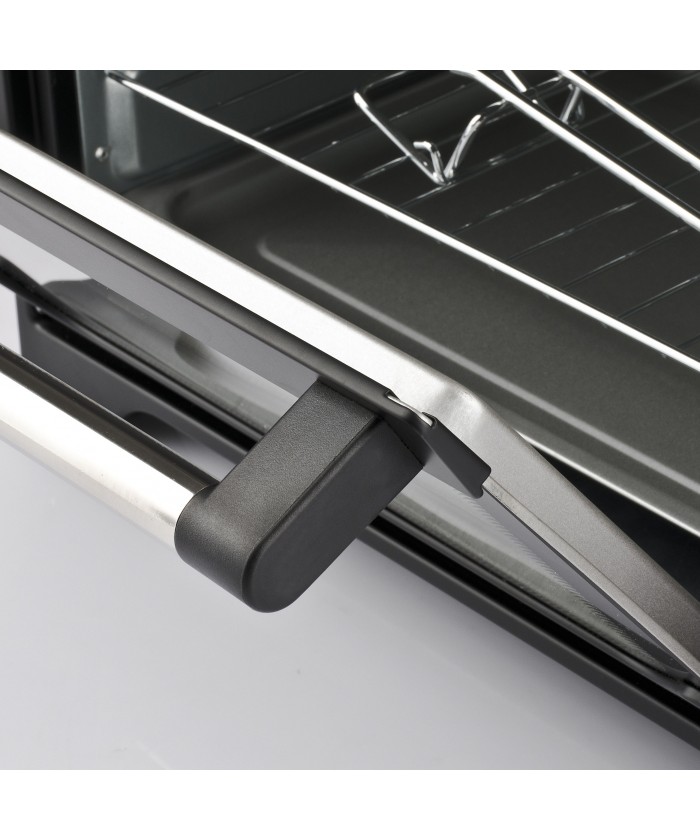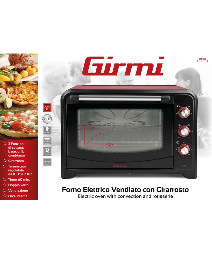 Grâce à son généreux espace de stockage de 60 litres combiné à sa puissance de 2000 watts, le four électrique FE60 peut cuire deux parcours simultanément en peu de temps: un accompagnement pour 6-8 personnes et un bon poisson, ou griller du pain et cuisiner à la même temps pizza pour toute votre famille. Équipé d'une convection qui permet de cuisiner uniformément et rapidement tout type de plat, cette unité est équipée d'une rôtissoire et dispose d'une minuterie de 60 minutes, d'une lumière interne pour garder un oeil sur vos plaques et un thermostat réglable (100-230 ° C ). 3 fonctions de cuisson sont fournies: cuisson standard, grille pour rendre croustillant et rôtir le meilleur plateau de la vaisselle et standard combiné. Pour assurer une sécurité maximale et une excellente économie d'énergie, le double verre est conçu pour maintenir une isolation thermique élevée, en évitant les brûlures accidentelles et les pertes de chaleur.