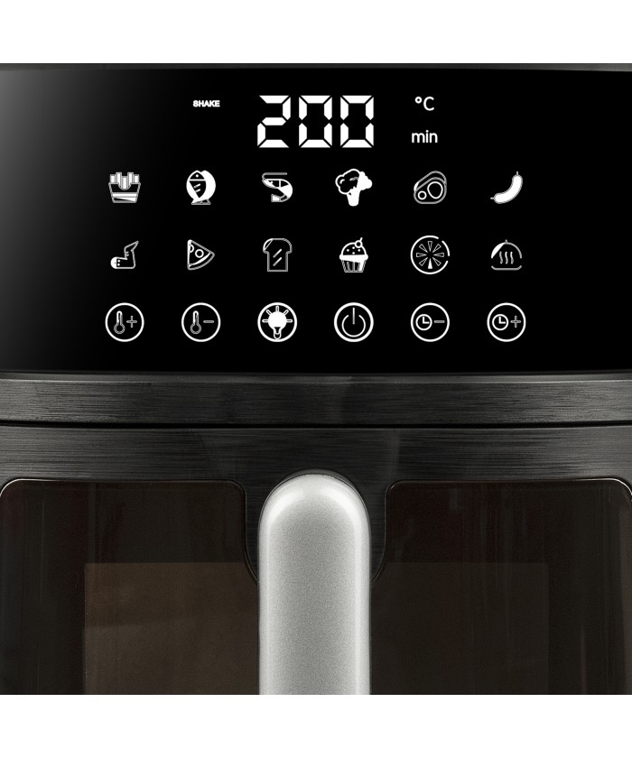 Mais pas seulement... Les possibilités de cuisson avec Ecofrit Black sont nombreuses. Dans notre friteuse à air, vous pouvez également cuire un gâteau, cuire du poisson ou des légumes et même rôtir de la viande ! Grâce aux 12 programmes prédéfinis, vous pourrez frire impeccablement frites, poulet, crustacés, viandes et poissons sans faire de dégâts dans la cuisine. Equipé d'un minuteur de 60 minutes, Ecofrit Black est également fourni avec un récipient antiadhésif amovible de 6 litres, idéal pour cuisiner pour toute la famille. Pour un maximum de confort, Ecofrit Black est équipé d'un grand écran numérique et le nettoyage devient également un jeu d'enfant ! Utilisez simplement une éponge non abrasive et de l'eau tiède pour nettoyer après la cuisson.