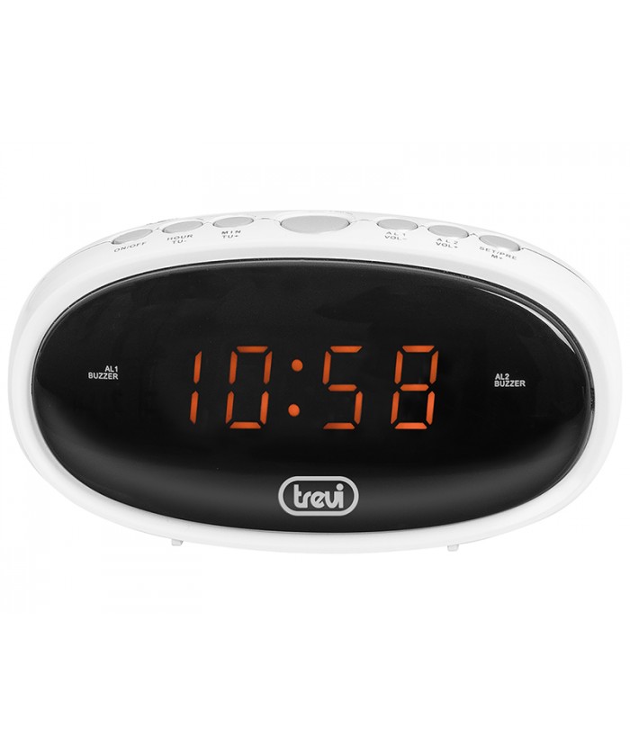 Cette horloge Trevi vous permet de configurer jusqu'à deux alarmes différentes qui activeront un carillon. Avec la fonction Snoozer peut décider de l'interruption momentanée tandis que la fonction d'alarme Dimmer ajuste l'intensité lumineuse de l'écran en fonction des conditions d'éclairage ambiant. L'alimentation électrique du produit s'effectue via un cordon d'alimentation 230V/50Hz .