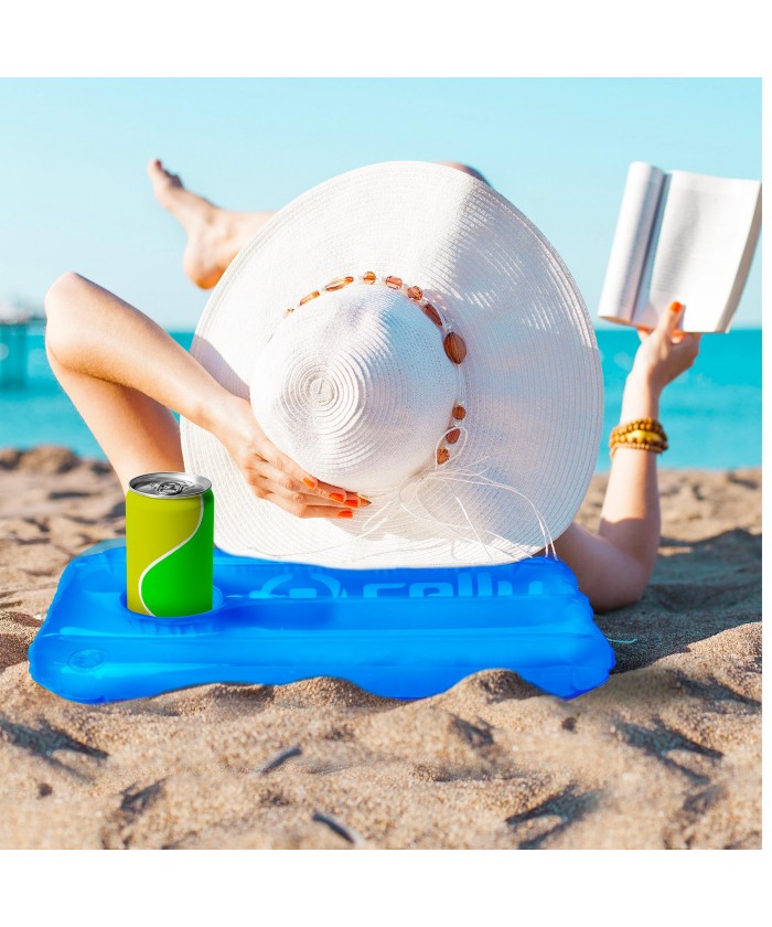 Lors des chaudes journées d'été, POOLPILLOW se transforme également en porte-gobelet pratique pour que vous puissiez vous détendre tout en sirotant un cocktail sur la plage.