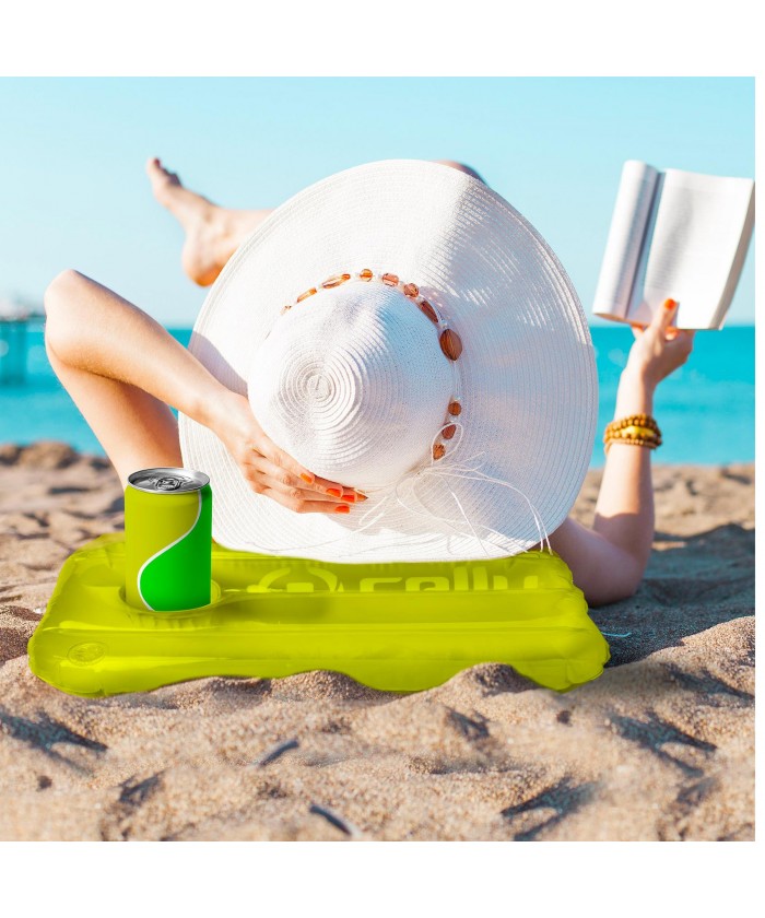 Lors des chaudes journées d'été, POOLPILLOW se transforme également en porte-gobelet pratique pour que vous puissiez vous détendre tout en sirotant un cocktail sur la plage.