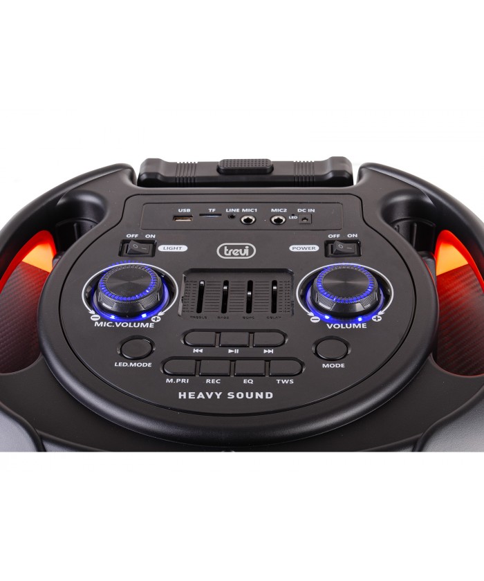 Passionné de karaoké ? Avec les deux entrées micro , le microphone dynamique inclus , les réglages de volume et les effets d'écho , organisez des séances de karaoké inoubliables entre amis. De plus, les lumières Discolight multicolores mobiles créeront une atmosphère festive et captivante. Un autre point fort de l'enceinte Trevi est sa portabilité : grâce à son chariot intégré et sa poignée extensible , vous pouvez facilement la transporter où vous le souhaitez. De plus, elle est conçue pour être installée et fixée sur des supports.