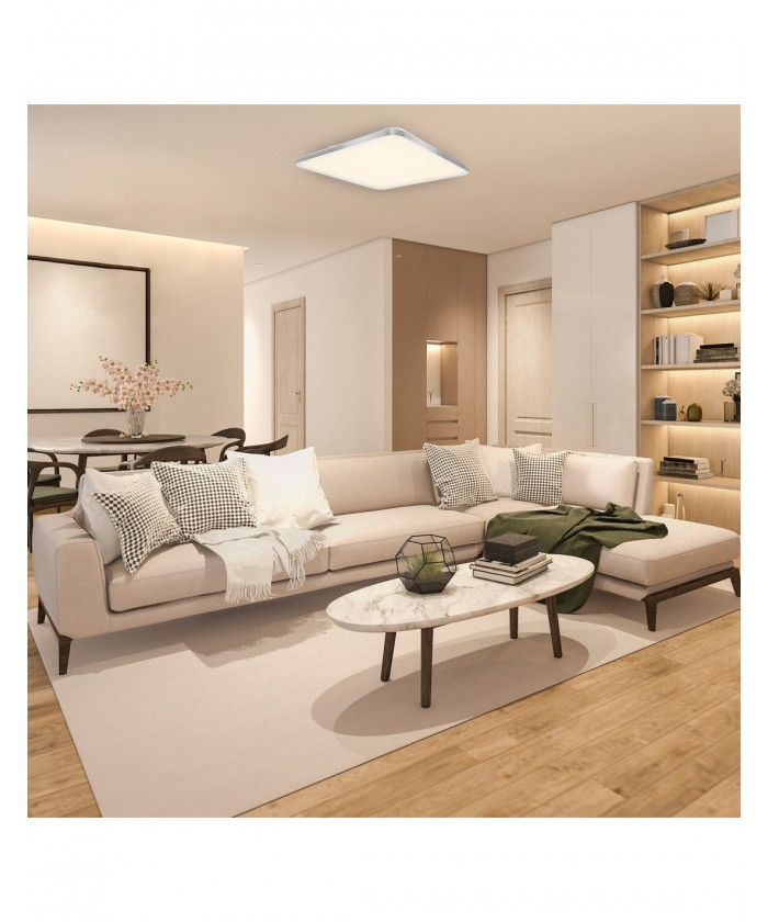 Grâce à son design carré minimaliste en blanc et ses dimensions de 47,5 x 47,5 centimètres et 6,2 centimètres d'épaisseur, le plafonnier Ksix Twilight s'adapte à n'importe quel espace et style. De plus, il est très simple à installer grâce à son poids de 1.350 grammes. Son indice de protection IP42 le rend résistant à la poussière et aux gouttes d'eau. Elle offre une durée de vie de 30.000 heures, elle sera donc votre source de lumière très longtemps.