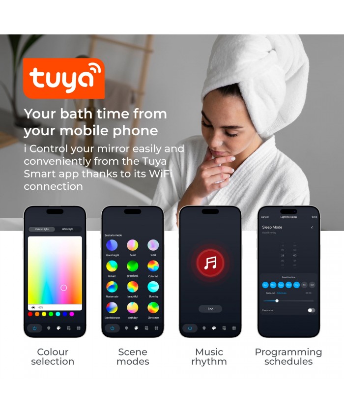 Associez votre miroir à l'application Tuya Smart pour profiter pleinement de ses fonctionnalités de manière simple et intuitive. Vous aurez la possibilité de programmer des horaires, de choisir parmi différents modes d'éclairage et de nombreuses autres options pour une personnalisation complète. Sa compatibilité avec les assistants vocaux tels qu'Alexa et Google Assistant vous permet de gérer toutes ses fonctions avec de simples commandes vocales. De plus, il comprend une télécommande pour tout gérer hors ligne.