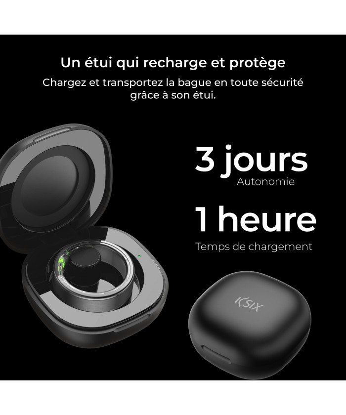 La bague KSIX Saturn est livrée avec un boîtier de charge qui vous permet non seulement de charger la bague jusqu'à 13 fois sans avoir besoin d'une connexion électrique. Il la protège également des rayures et des chutes. Avec seulement une heure de charge, la bague intelligente sera prête à fonctionner pendant 3 jours.
