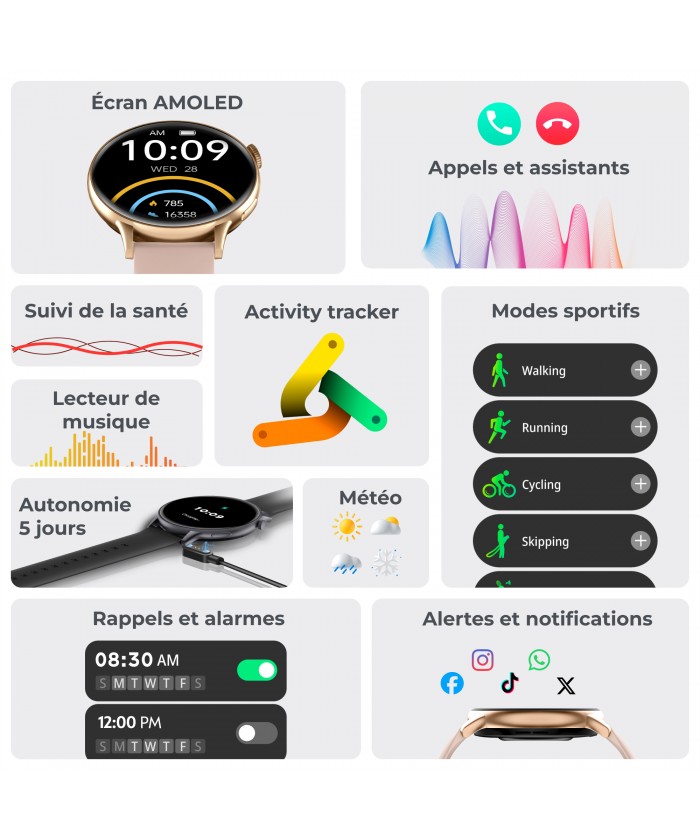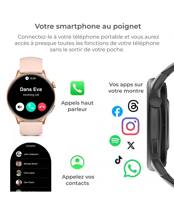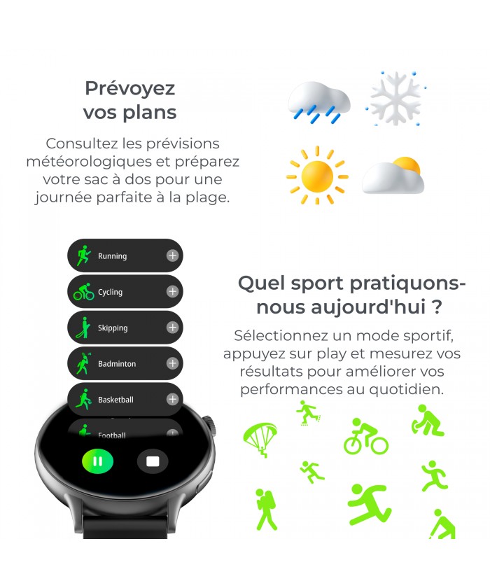 La montre connectée KSIX Core 2 est votre partenaire idéal pour un style de vie actif. Dotée d'un écran AMOLED de 1,43'' aux couleurs vives et d'une netteté exceptionnelle, elle vous offre un suivi de votre santé et de vos entraînements via votre montre et à l'aide de sa propre application. Grâce à son microphone et son haut-parleur intégrés, vous pouvez recevoir et passer des appels, ainsi qu'activer vos assistants vocaux. De plus, vous pouvez utiliser à distance l'appareil photo de votre téléphone portable pour prendre des photos. La KSIX Core 2 s'adapte au rythme de votre vie.