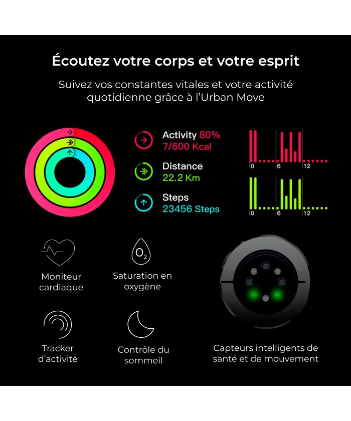 Prendre soin de soi n'a jamais été aussi simple avec Urban Move. Grâce à une surveillance avancée de la santé, vous pouvez suivre votre rythme cardiaque, la qualité de votre sommeil, votre taux d'oxygène dans le sang et votre stress en temps réel. Tout cela est pris en charge par des capteurs avancés et une application dédiée, vous donnant un contrôle total sur votre bien-être.