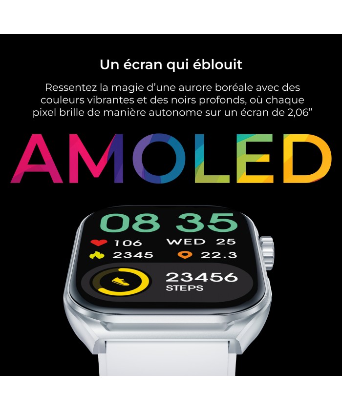 Profitez de l'écran AMOLED 2,06 pouces aux couleurs vives, conçu pour offrir une qualité d'image exceptionnelle. Avec une résolution de 401 x 502 pixels, vous profiterez de couleurs vives et d'un contraste supérieur, même en plein soleil. Personnalisez votre style avec plus de 100 cadrans de montre ou créez votre propre design, pour rendre chaque jour unique.