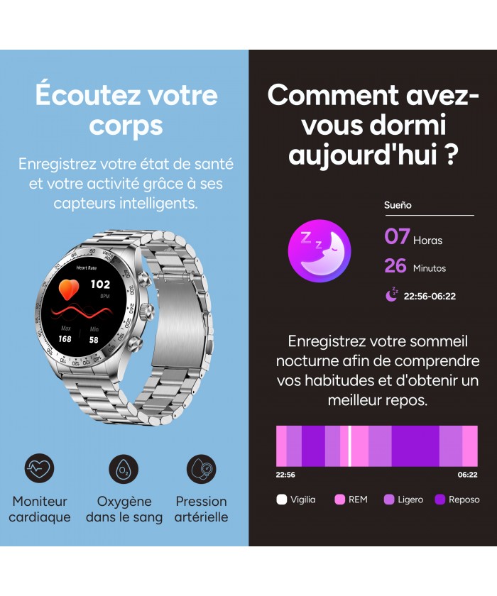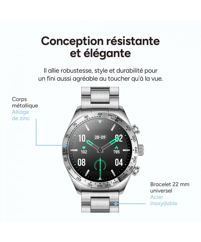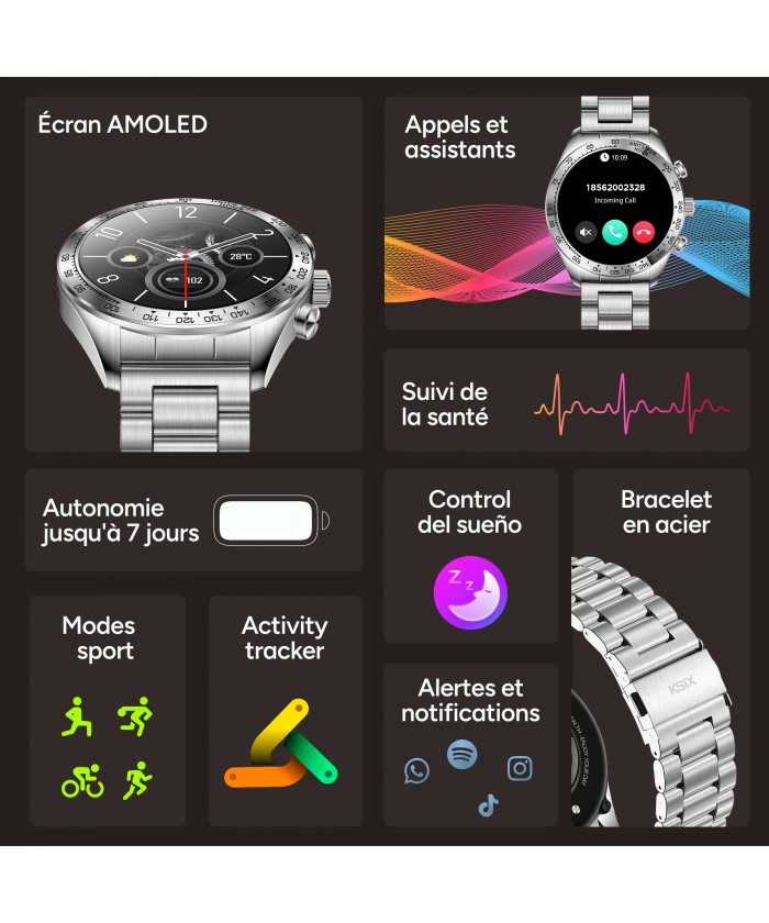 La KSIX Elite allie design intemporel et technologies de pointe. Son écran AMOLED de 1,43" offre des images nettes et éclatantes, tandis que son boîtier en alliage de zinc et son bracelet en acier inoxydable lui confèrent une touche de sophistication et de durabilité. Avec jusqu'à 7 jours d'autonomie, elle vous permet de rester connecté avec style pour prendre soin de votre santé, rester actif et gérer votre quotidien.