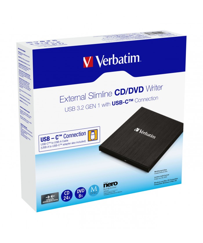 Le graveur de CD/DVD externe ultra mince de Verbatim avec connexion USB-C est la solution : cet appareil compact complète idéalement votre notebook, ultrabook, netbook, voire votre PC. Utilisez-le pour installer vos logiciels ou pour vos sauvegardes. Le graveur de CD/DVD externe ultra mince de Verbatim est à peine plus grand qu’un DVD. Grâce son port USB, vous n’avez pas besoin d’avoir un adaptateur de courant encombrant !
