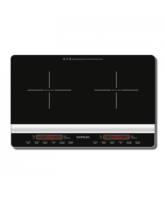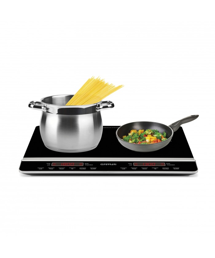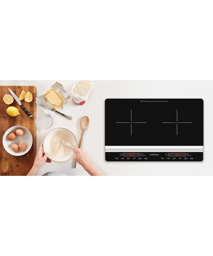 Plaque de cuisson double avec puissance et température réglables, un seul verre à nettoyer.