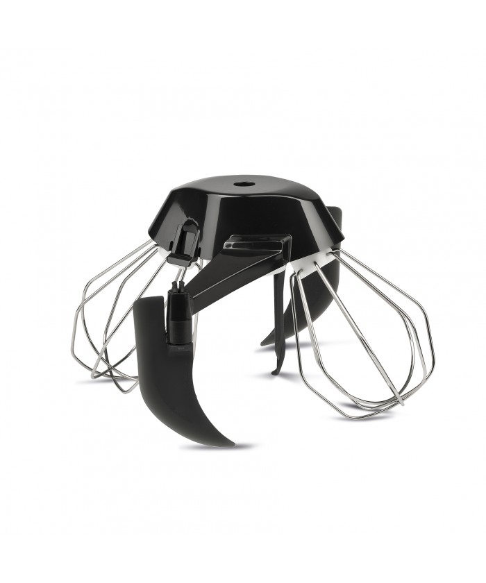 Accessoires : double batteur en inox, double mixeur, double crochet en aluminium, spatules en silicone, couvercle transparent