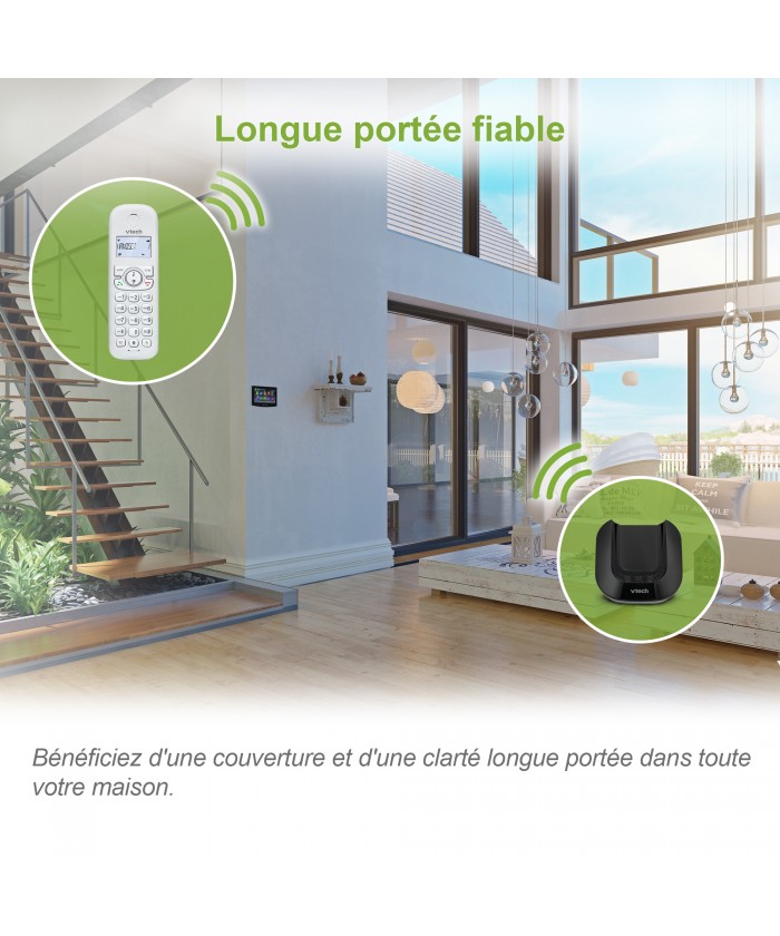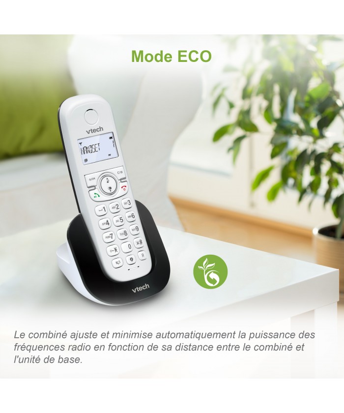 Le combiné ajuste et minimise automatiquement la puissance des fréquences radio en fonction de la distance entre le combiné et l'unité de base.