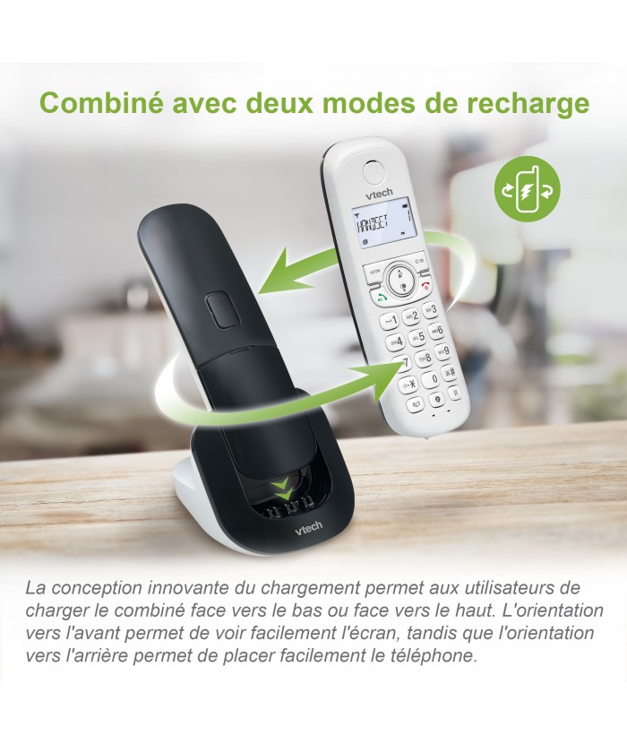 La conception de charge innovante permet aux utilisateurs de charger le combiné face vers le bas ou face vers le haut. L'orientation vers l'avant permet une visualisation facile de l'écran, tandis que l'orientation vers l'arrière peut être pratique pour un placement facile et en conservant le design élégant global. Le choix t'appartient.